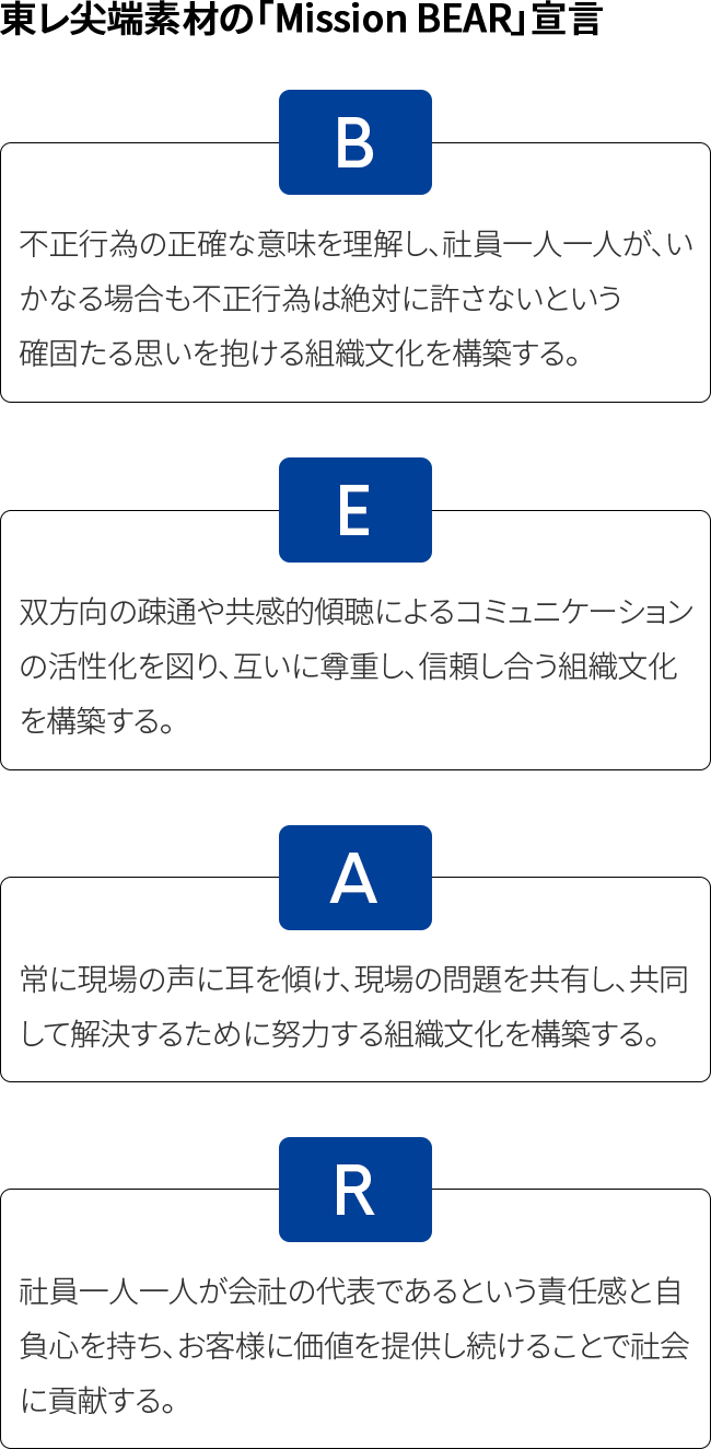 東レ尖端素材の全ての従業員は正しい倫理意識を有し、それを実行するため Mission BEAR活動を展開しています。
